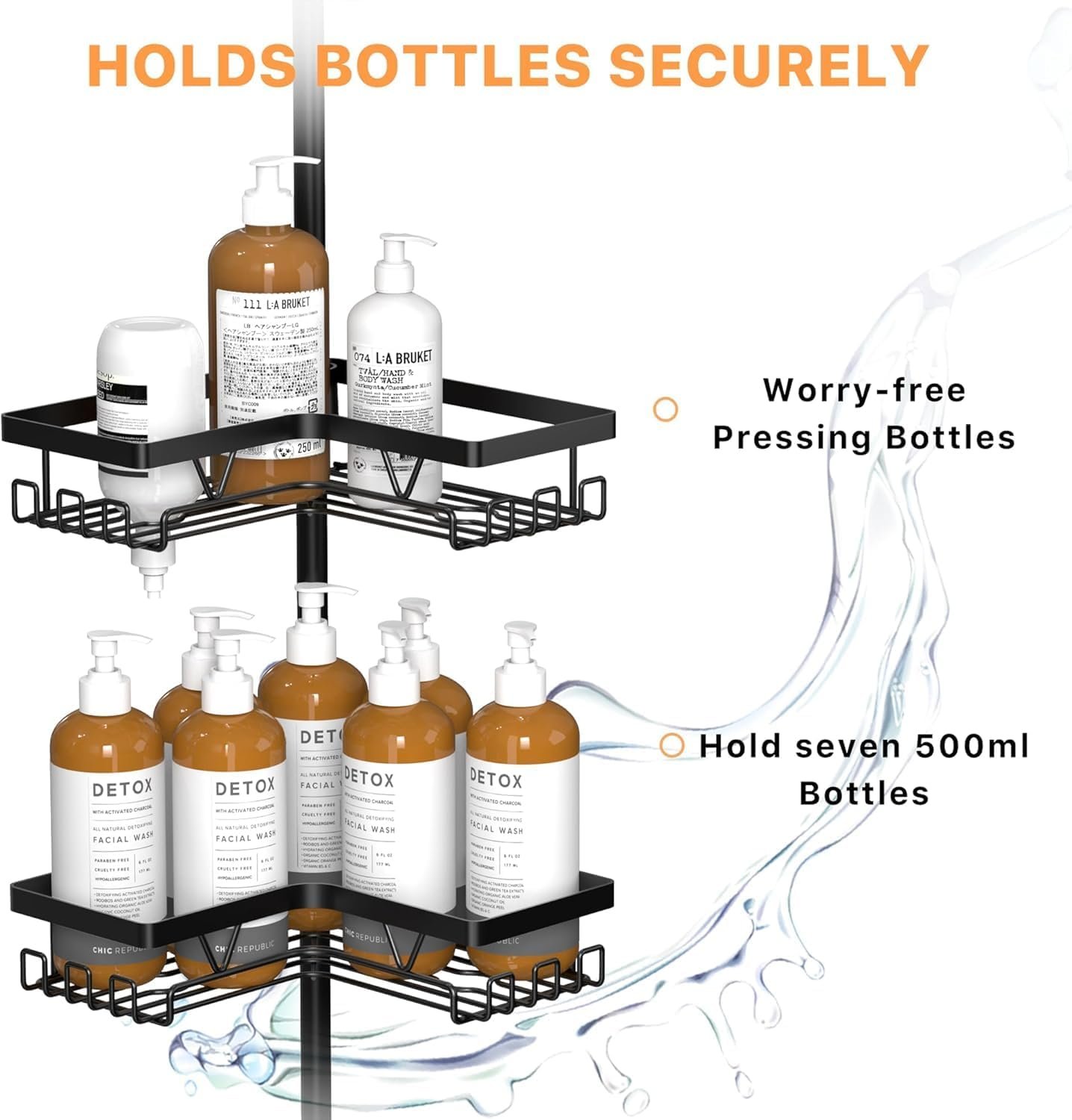 Corner Shower Caddy Tension Pole with Toothbrush Holder – Adjustable Tension Pole, Rustproof Bathroom Storage Shelf, Fits 25–114.2 Inch Floor to…